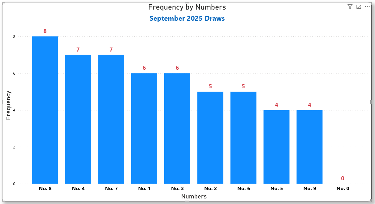 The chart above shows our month end analysis. The numbers that constantly hit a high for the month of September 2025 were 8, 4, 7, 1, 3, 2, 6, 5, 9 and 0. This means that out of the 12 draws that took place in September, number 8 appeared the most for 8 out of the 12 draws!
